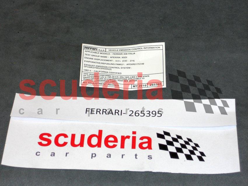 Ferrari part number 265395 is a high-quality adhesive label specifically designed for the 458 Italia model. This label serves the essential function of providing clear identification for various components, enhancing organization and maintenance efficiency. Made from durable materials, it is resistant to fading and wear, ensuring longevity even in challenging environments. The installation of this label is straightforward, adhering securely to clean, dry surfaces within the vehicle. It is crucial for maintaining proper identification of parts, which can aid in troubleshooting and repairs. Regular inspection of the label is recommended to ensure it remains intact and legible. If the label shows signs of peeling or fading, replacement is advised to maintain clarity in component identification. Proper labeling is vital for effective vehicle maintenance and safety.
